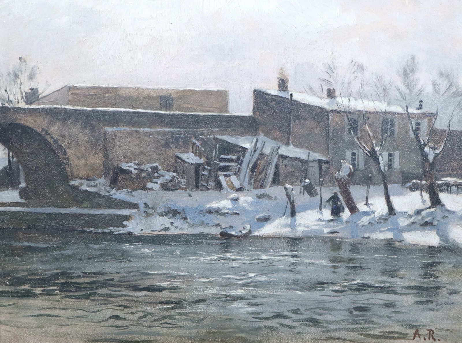 Le pont de Viller à Lunéville avec effets de neige vendu aux enchères