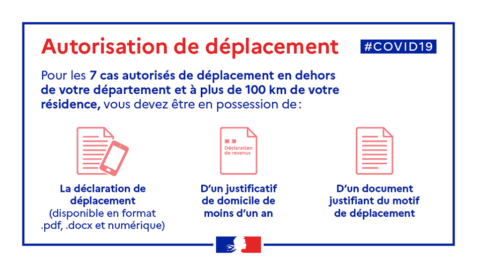 Au delà de 100 km et en dehors du département, les déplacements sont possibles pour des motifs impérieux familiaux et professionnels en remplissant une attestation.