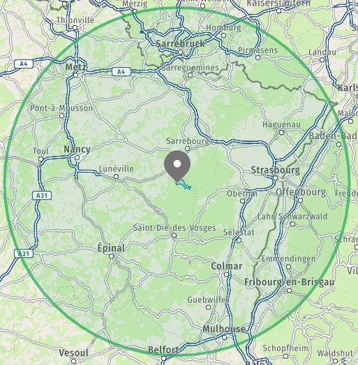 Vous pouvez notamment déterminer le rayon de 100km autour de Val-et-Châtillon en utilisant ce site : https://fr.mappy.com/confinement/ville/54480-val-et-chatillon . Le rayon est la suivant :