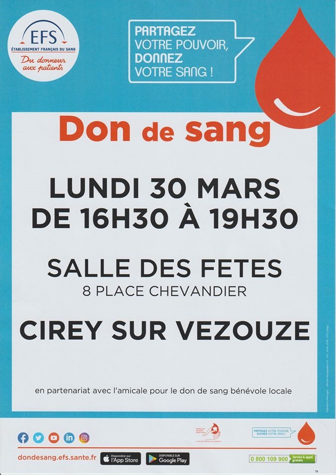 Don du sang le 30 mars à Cirey