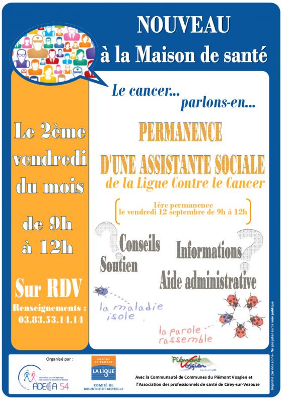 Pour répondre aux besoins exprimés lors de la rencontre « Le Cancer…parlons en… » qui a eu lieu le 04 juillet dernier à la salle des fêtes de Cirey-sur-Vezouze, une assistante sociale de la Ligue contre le Cancer va assurer une permanence à la Maison de santé. Elle recevra les personnes intéressées sur rendez-vous le 2ème vendredi de chaque mois de 9h à 12h à la Maison de Santé avec un démarrage prévu le vendredi 12 septembre.