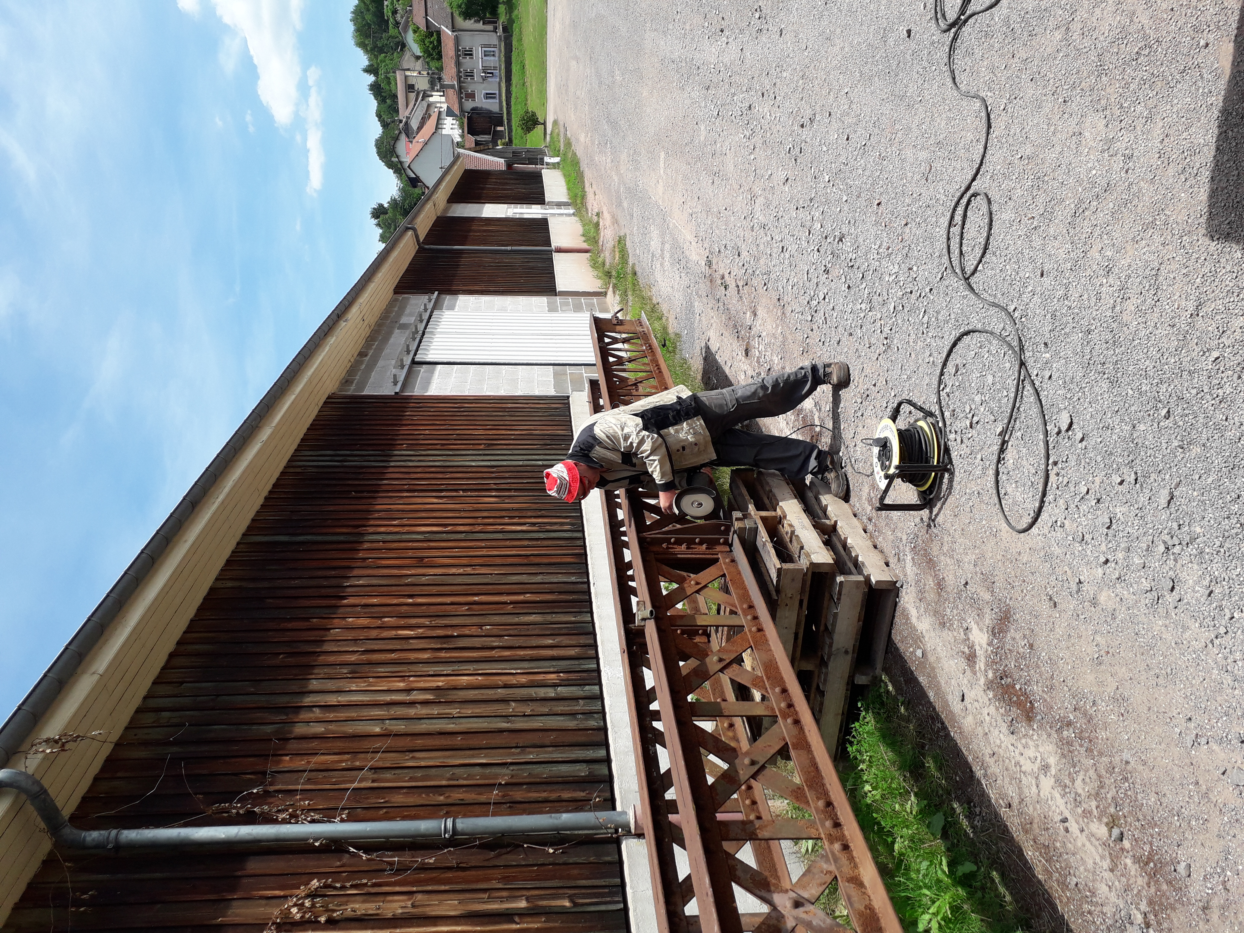 Préparation des poutres pour la passerelle Bajeu Etang